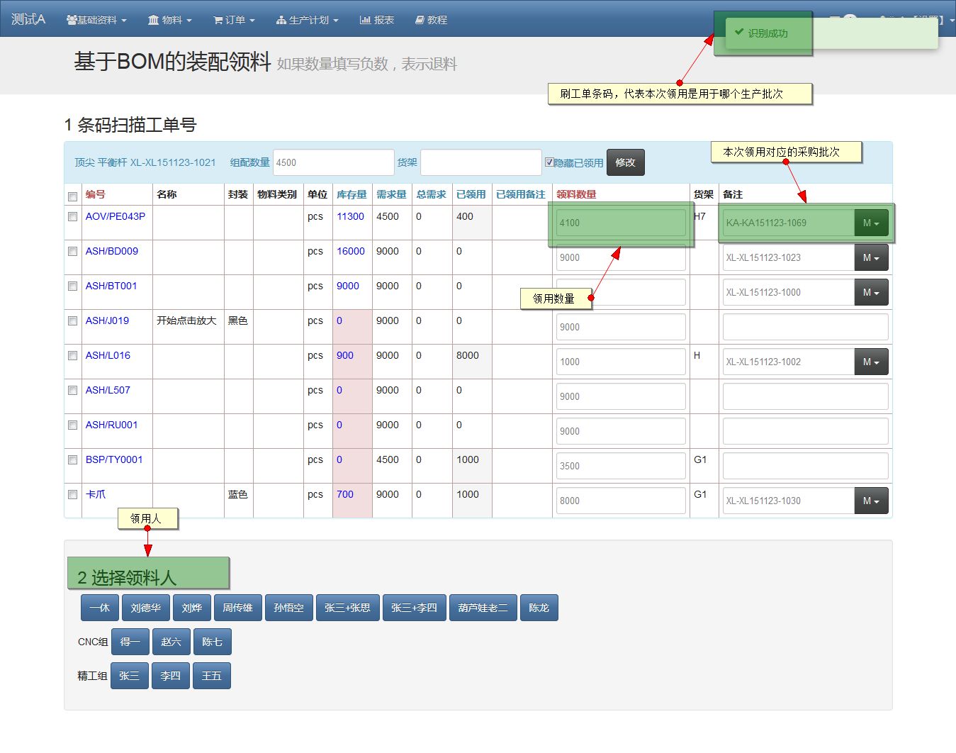 - 仓管点领料人的名字,或者扫员工条码。