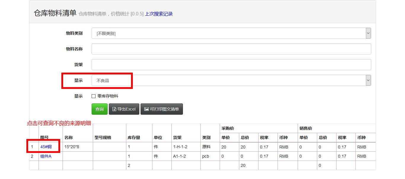 速易天工ERP系統 通過“倉庫物料清單”報表來查詢不良品和在庫庫存。如下圖