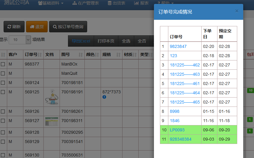 類似于BOM合計的功能。一般來說,一份訂單號會包括多個產品。這里可以把同一個訂單號的產品完全情況疊加在一起查詢。如左圖,全部完成的訂單號會顯示綠色,未完成(包括部分出貨的)的訂單顯示白色。這樣可以一目了然地看出哪些訂單沒有完成。